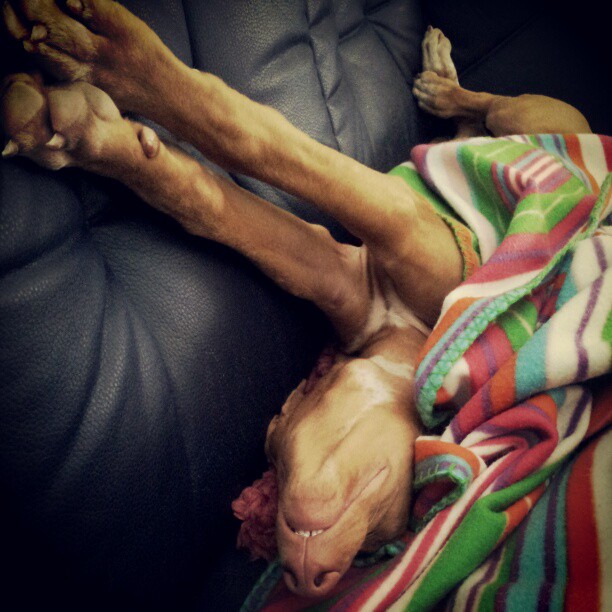 Vi firar in julen med att ligga på rygg ett tag. Xena här haft en mindre trevlig morgon med en till tappad tand. De verkar nu ramla ur till höger och vänster just nu. Så idag blev det uppblött mat och det föll verkligen tjejen i smaken. Astrid ligger och gottar sig i sängen och jag och lillisen i soffan.